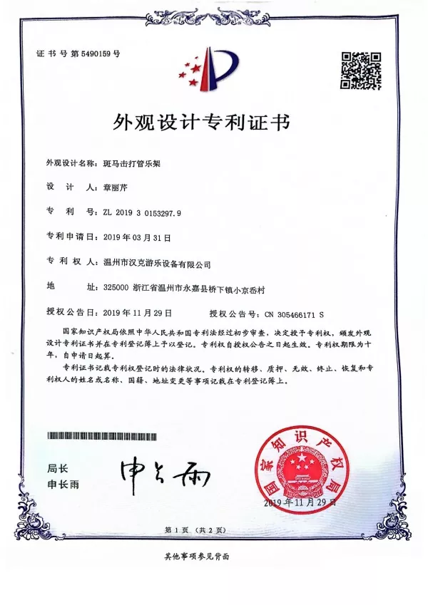 ඒ අතරම, Hank හි හිමිකාර නිෂ්පාදනයක් ලෙස, අපි 2019 දී Zebra Shaped Percussion Instrument stand සඳහා නිර්මාණ පේටන්ට් සහතිකයක් සඳහා ඉල්ලුම් කර චීන බුද්ධිමය දේපල කාර්යාලයෙන් අනුමැතිය ලබා ගත්තෙමු.